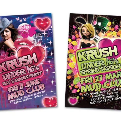Flyer designs for Under 18s club nights are an ongoing challenge to keep the designs fresh, interesting and appealing to a very fickle market. One minute the club night is flavour of the month and the club is rammed – if you’re not careful, they are deserting you in droves! The Krush nights were aimed at Under 16s (even more difficult to please!) and always had a theme which was reflected in the flyer designs.